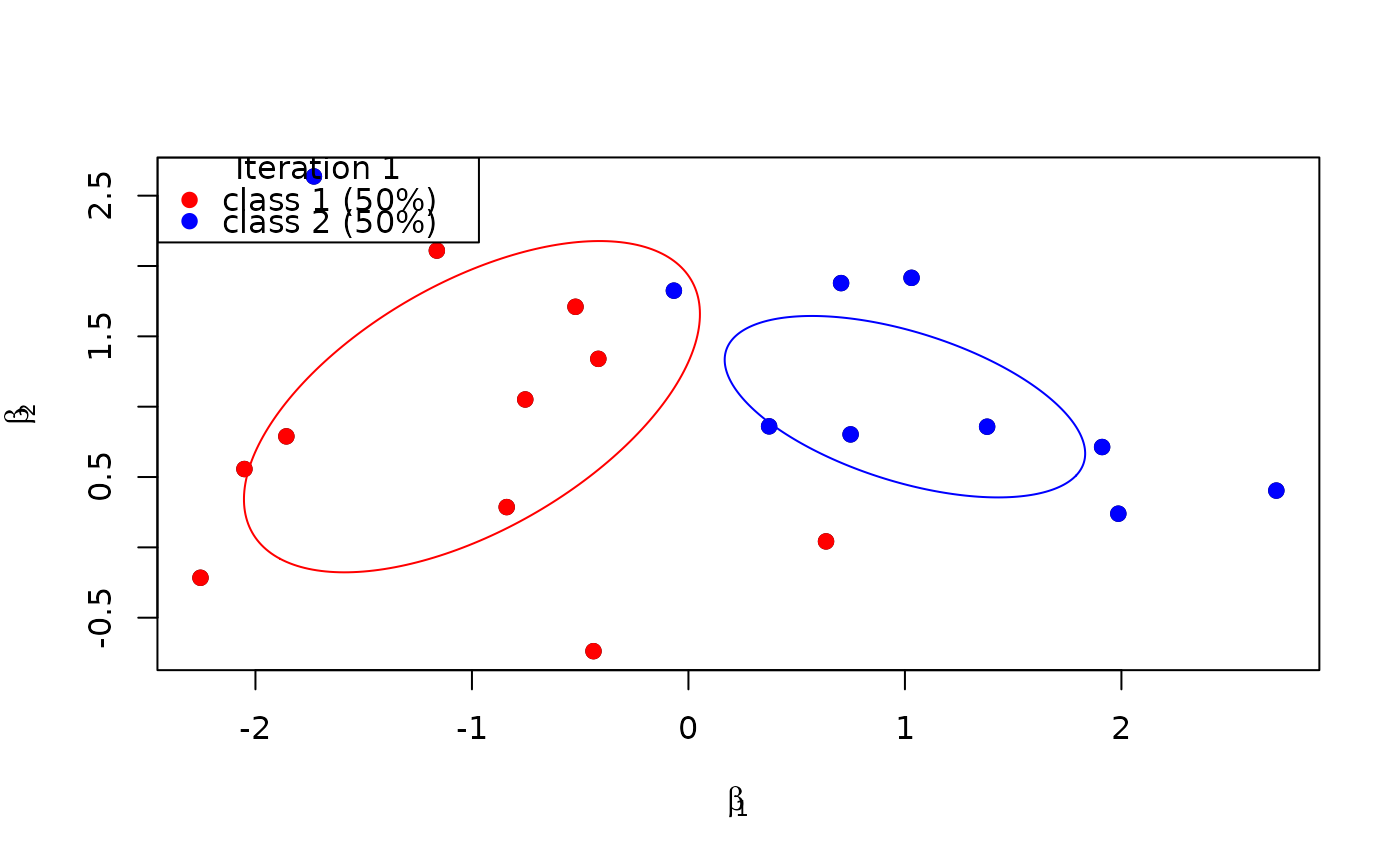 colors, a character vector of color specifications,perc, a numeric between 0 and 1 to draw thepercpercentile ellipsoids for the underlying Gaussian distributions (perc = 0.95per default),r, the current iteration number of the Gibbs sampler to be displayed in the legend,sleep, the number of seconds to pause after plotting.